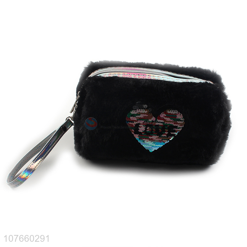 Good quality black love sequined toiletry bag fluff cosmetic bag