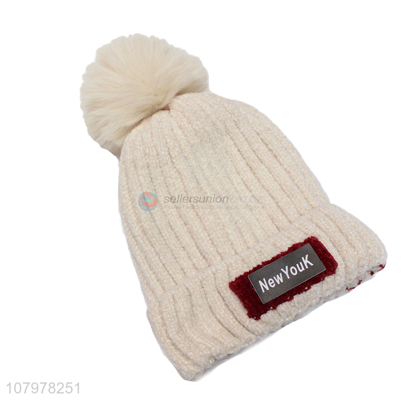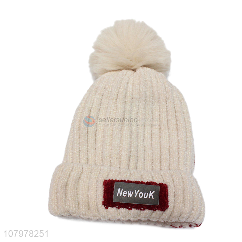 Low price kids autumn winter fleece lined beanie with faux fur pom pom