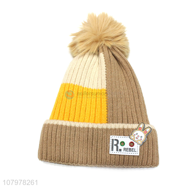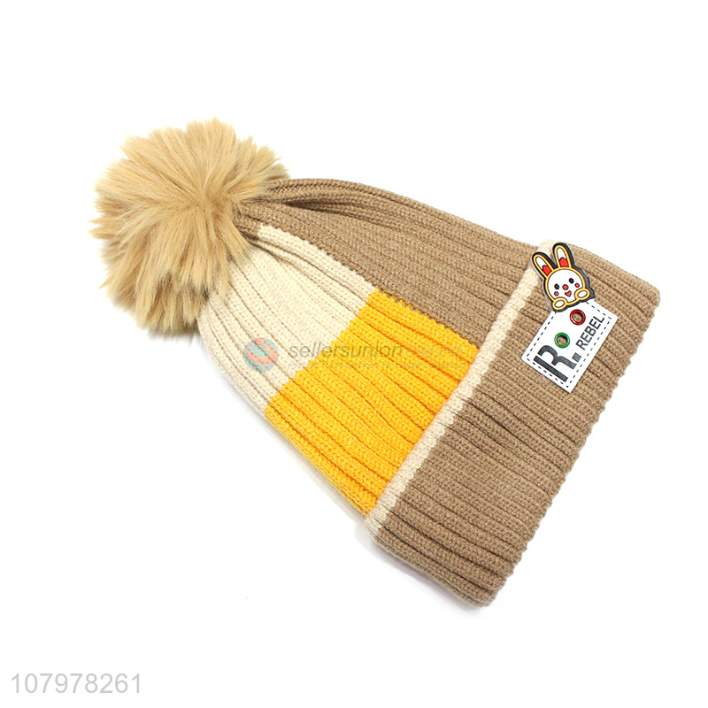 Online wholesale children winter warm pom pom beanie hat with fleece lining