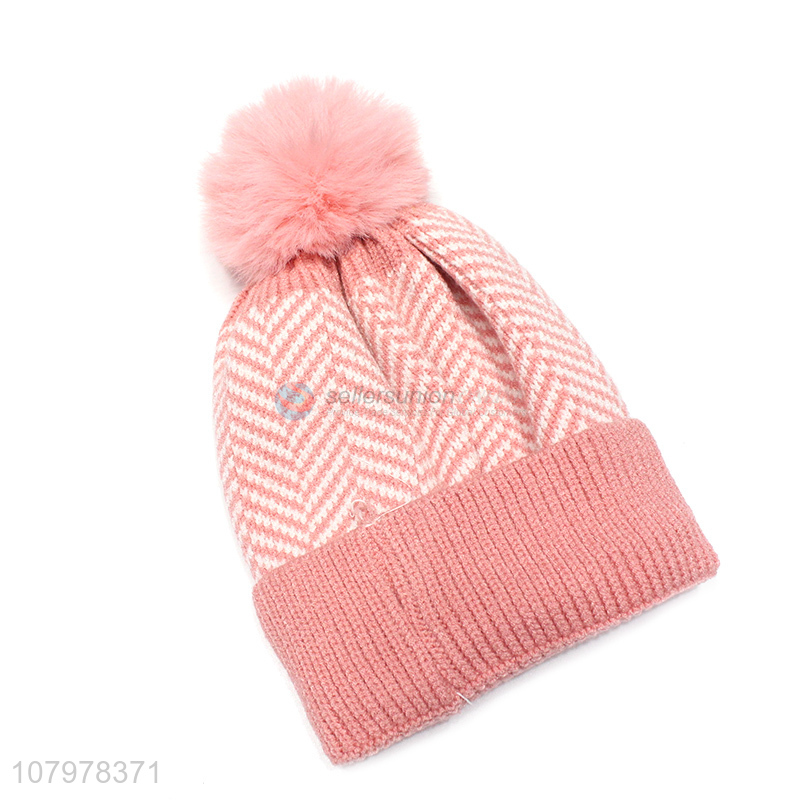 Hot items kids winter knitted beanie fleece lined hat with pom pom