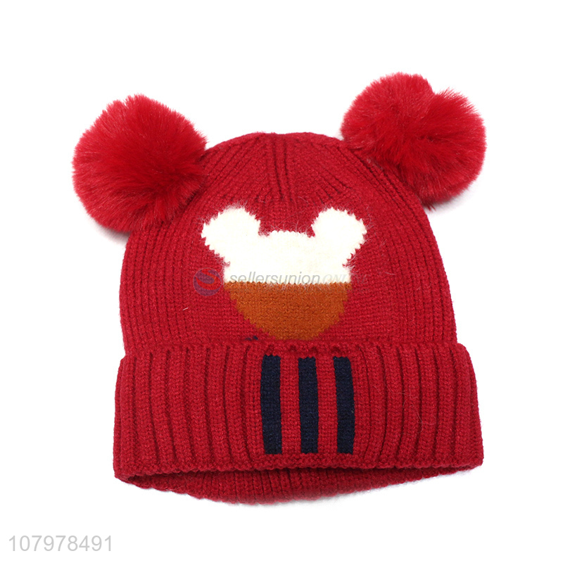Wholesale kids fleece lined beanies winter jacquard hat with double pompoms
